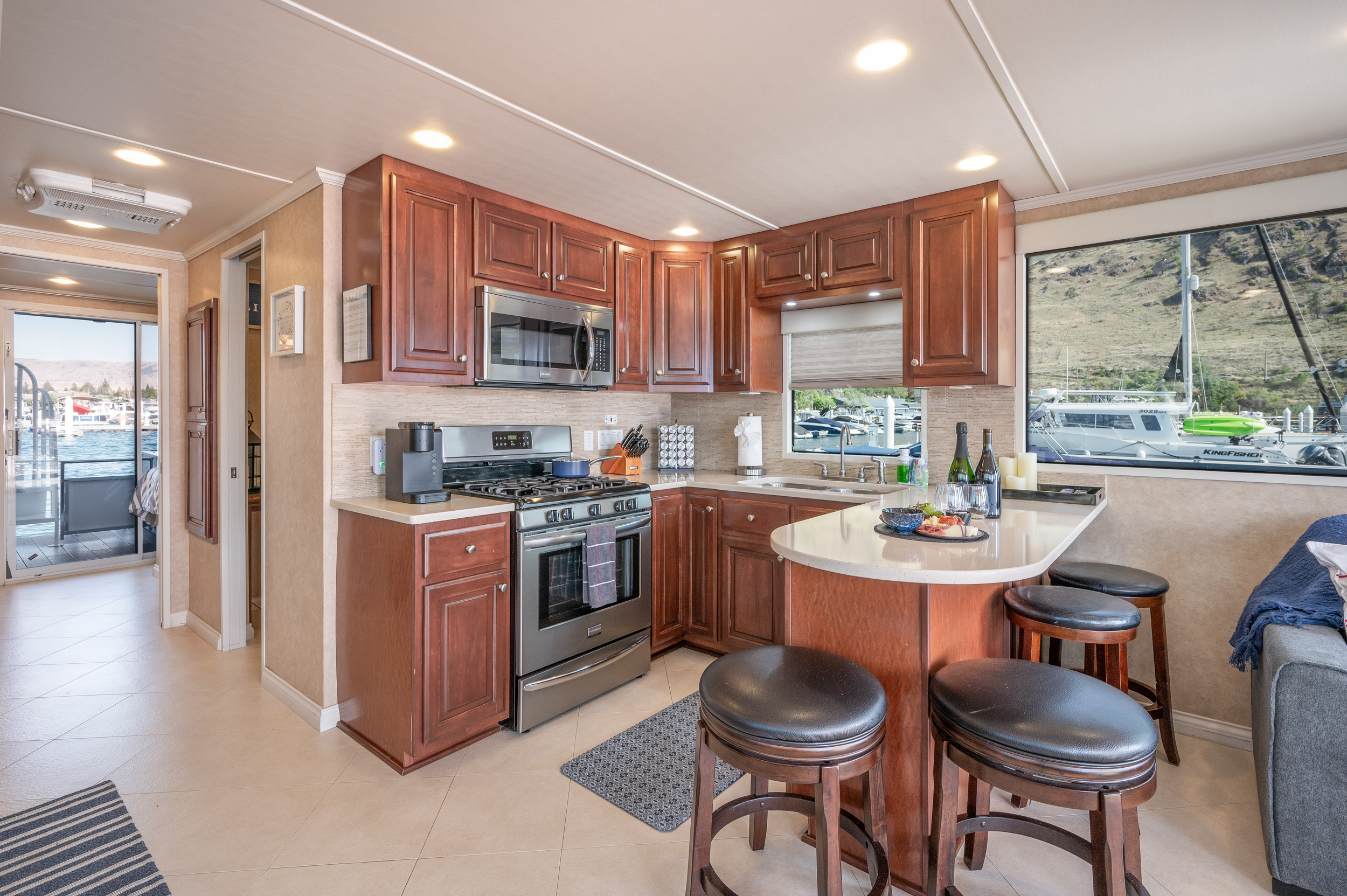 Savor the serenity of lakefront living from the moment you arrive. Our cozy yet spacious houseboat features 2 bedrooms and 1 bath, providing comfortable accommodations for your group of adventurers. Relax in the inviting living area, whip up delicious meals in the fully equipped kitchen, or simply unwind on the rooftop deck as you soak in the breathtaking vistas of Lake Chelan and the surrounding mountains.