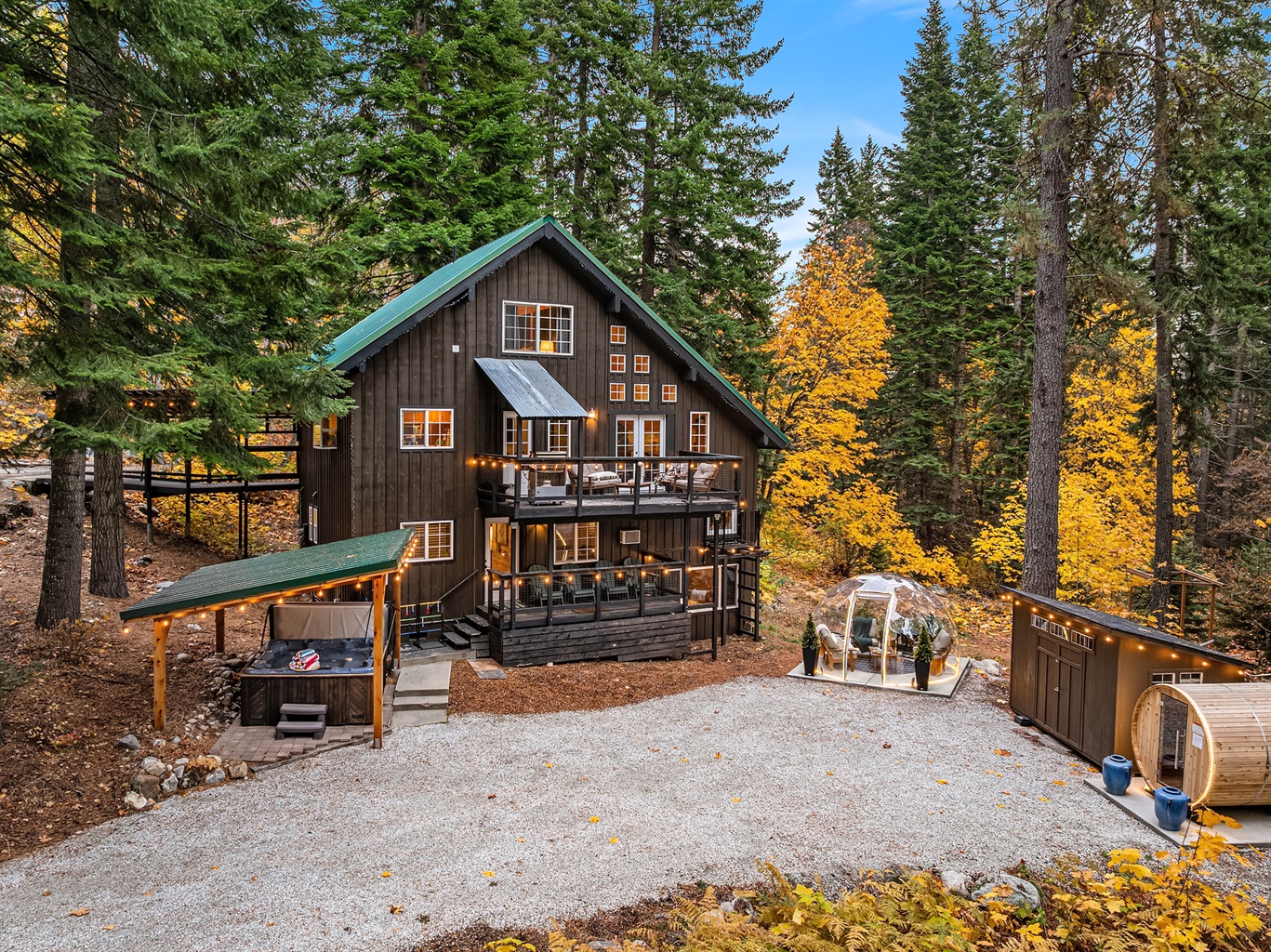 With multiple levels, two living spaces, and cozy nooks, this home is designed for both relaxation and togetherness. Gather around the wood stove and watch the snow fall through the French doors or sink into the hot tub under a canopy of stars after a day of hiking or skiing. For added wellness and relaxation, enjoy the private sauna tucked just outside the home.