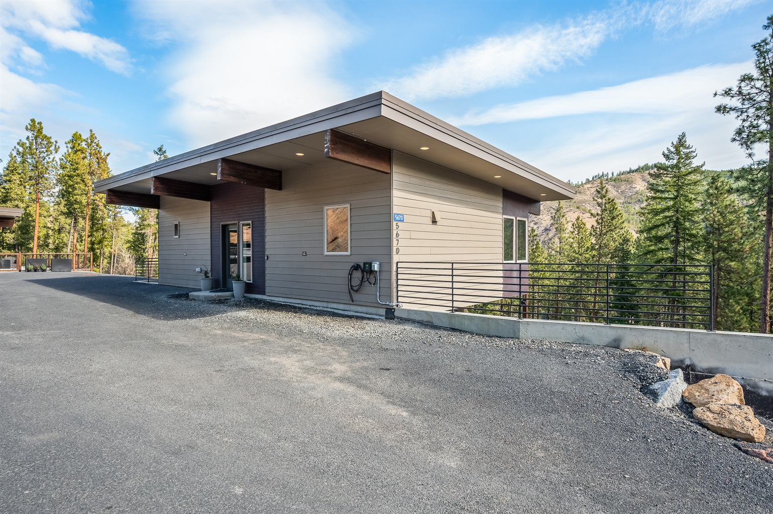 There are 5 exterior cameras on the property. For the guesthouse, there is one that points at the garage doors and slightly captures some of the hot tub and outside seating area. The owners' main home has 4 cameras that are pointed at their main entry points and the driveway where guests will park and turnaround. These cameras help monitor weather, potential wild animals and for guest safety.
